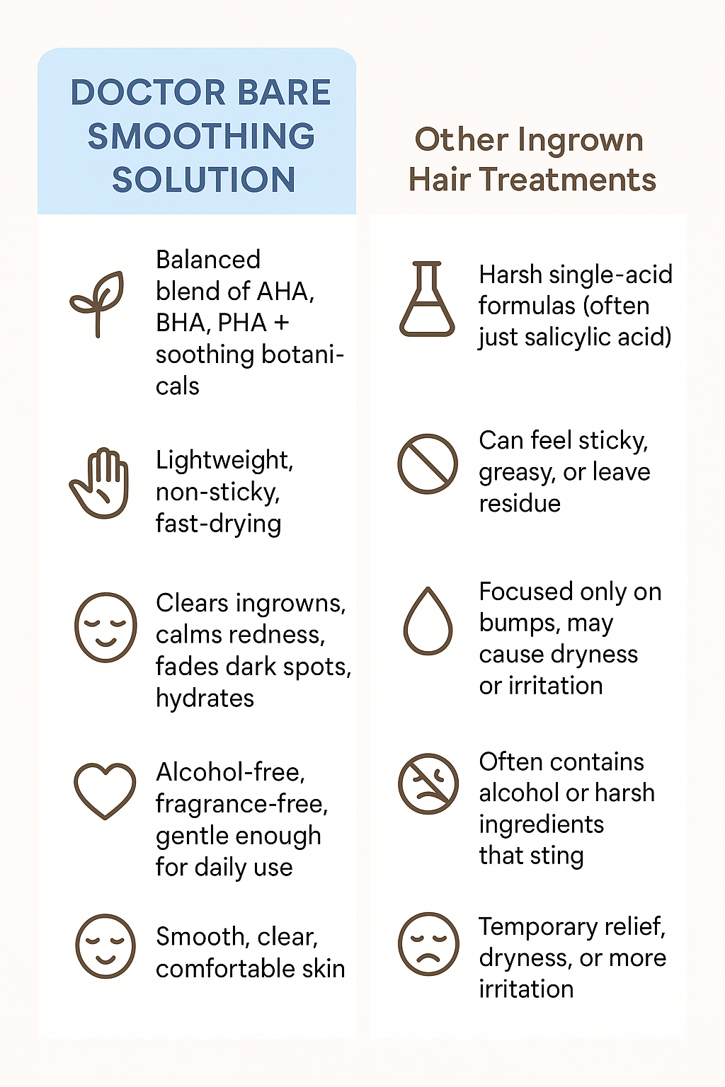 If you are struggling with razor bumps, redness, and stubborn ingrown hairs then allow us to present you with Doctor Bare's Smoothing Solution. This gentle yet effective treatment is designed to smooth skin, unclog pores, and calm irritation so you can feel confident after every shave or wax. The lightweight, non-sticky solution dries quickly and is safe for use on legs, underarms, bikini line, and anywhere you struggle with bumps or irritation.